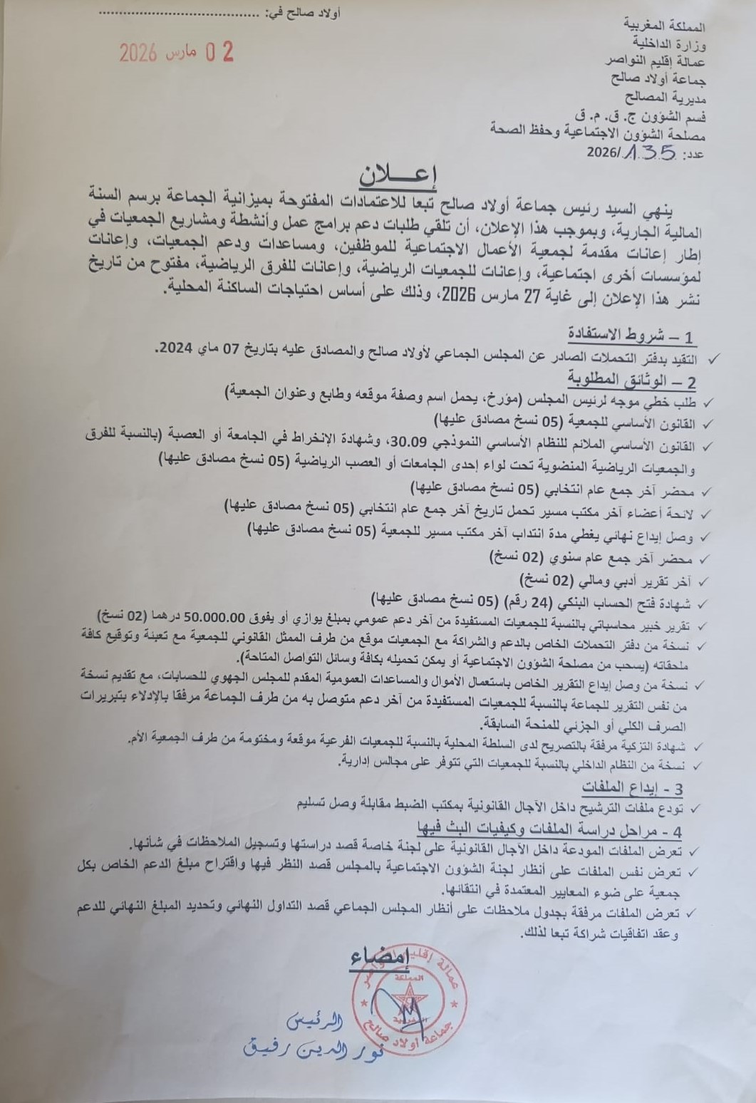 قامت جماعة أولاد صالح بفتح باب تقديم الطلبات الخاصة بدعم برامج عمل الجمعيات وأنشطتها الاجتماعية، الثقافية والرياضية برسم سنة 2026. ويأتي هذا الإجراء في إطار تخصيص اعتمادات مالية لدعم المبادرات الجمعوية الهادفة إلى تعزيز التنمية المحلية، حيث دعت جماعة أولاد صالح مختلف الجمعيات إلى إعداد ملفاتها وفق الشروط القانونية والإدارية المحددة، وإيداعها داخل الآجال المقررة